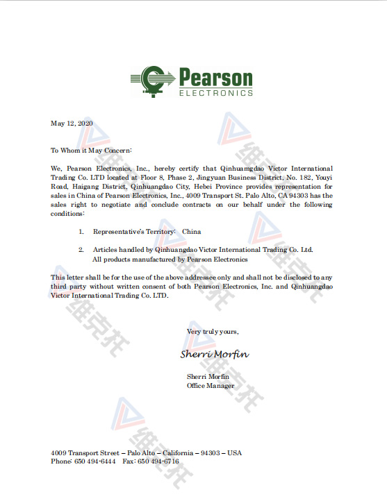 秦皇島維克托國際貿易有限公司于2020年5月12日取得了Pearson Electronics(皮爾遜電子)公司產品的代理權。我們是Pearson中國區(qū)代理商。主要代理產品有Pearson電流互感器、Pearson電流監(jiān)控器等。如果您有Pearson Electronics(皮爾遜電子)產品的采購需求,請與我們聯(lián)系,我們會竭誠為您服務!